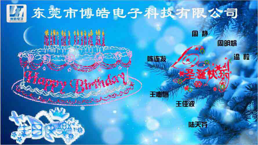 12月24日晚上八點(diǎn),博皓硅膠按鍵廠舉行了年終員工生日會(huì)。12月份壽星一共有7位,來自不同的硅膠生產(chǎn)部門。本次活動(dòng)為2016年博皓電子舉行的12期生日會(huì)活動(dòng)畫上了圓滿的句號(hào)。