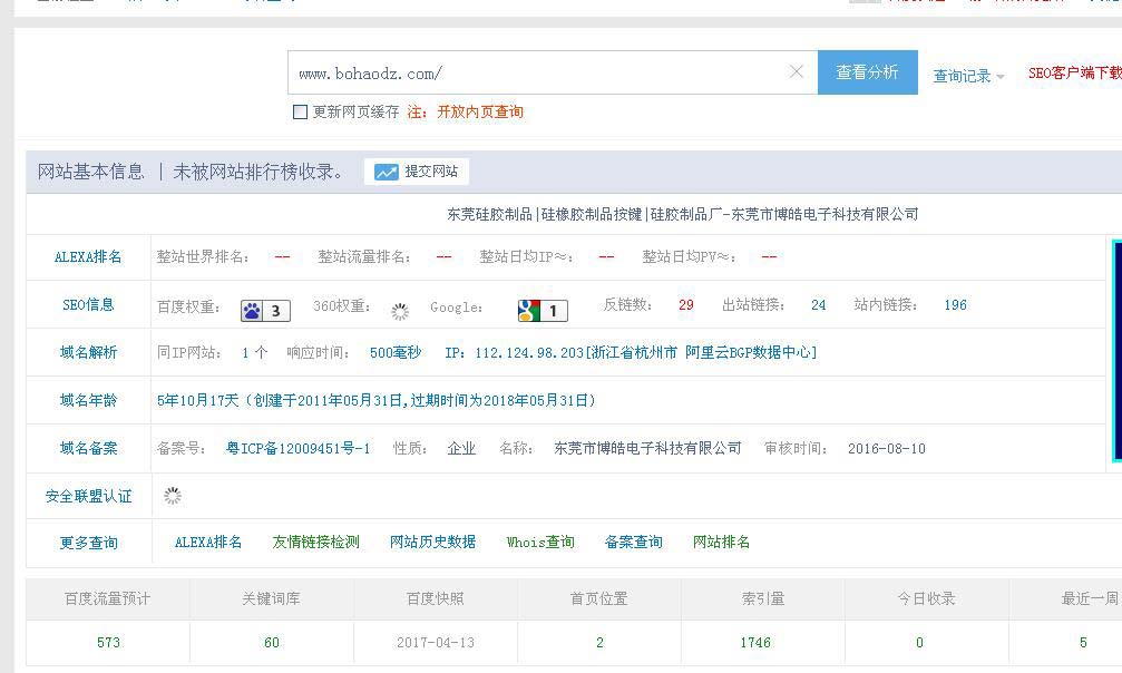 今天早上小編查詢博皓電子官網(wǎng)的站長(zhǎng)的SEO數(shù)據(jù),發(fā)現(xiàn)一個(gè)不小的驚喜,那就是博皓電子(m.quiz-blitz.com)官網(wǎng)百度權(quán)重到3了。之前小編一直在心中提問(wèn),硅膠制品行業(yè)的官網(wǎng)可以優(yōu)化到3不?當(dāng)時(shí)心中是認(rèn)為不太可能的,今天也終于實(shí)現(xiàn)了。