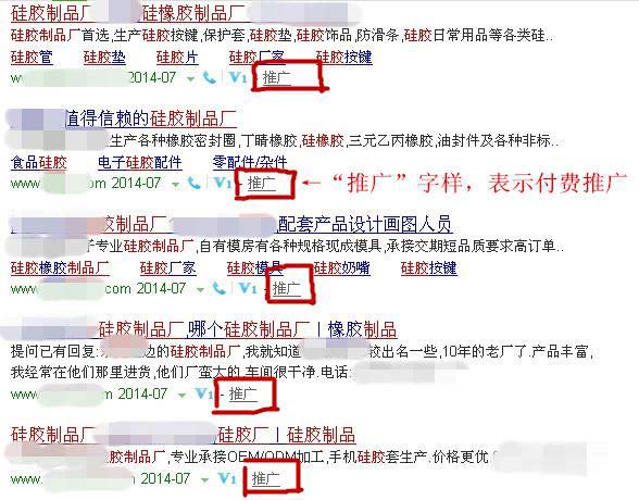 如下圖中:通過搜索“硅膠制品廠”而出現(xiàn)的鏈接里有“推廣”兩個字的,則說明這家企業(yè)是通過付費(fèi)使這條鏈接出現(xiàn)在了首頁。