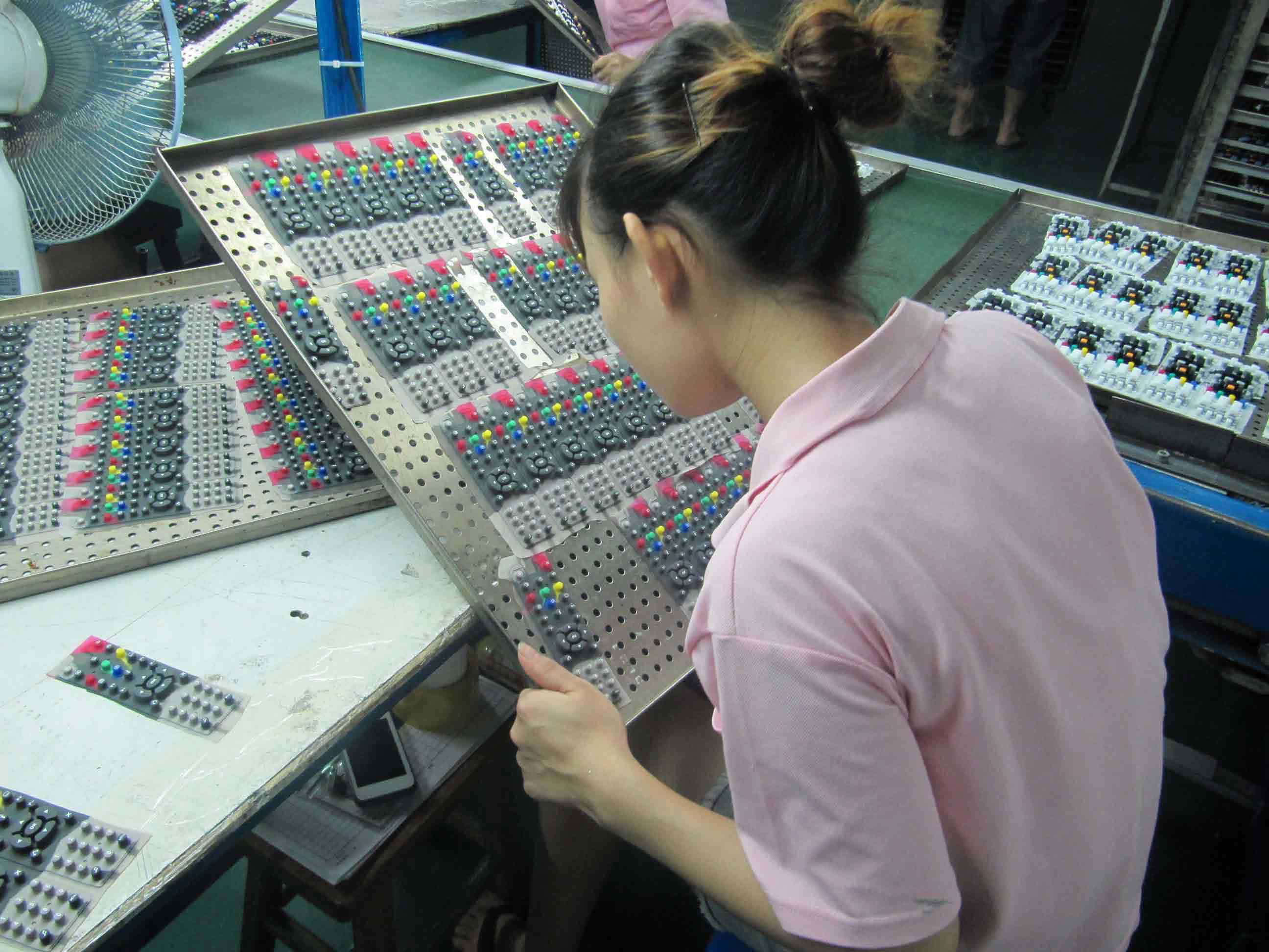 從絲印工藝要求講:一般現(xiàn)在的硅膠按鍵都是需要絲印四五種的顏色,每一種顏色都是需要經(jīng)過一次檢查和烘烤的。博皓電子在管控絲印品質(zhì)過程中增加一個(gè)FQC檢查崗位,在絲印完成后烘烤前會(huì)檢查員會(huì)把產(chǎn)生的不良挑選出來,并且擦拭干凈重新絲印。一般的小型工廠是不會(huì)增加這種檢查崗位的,這就是博皓電子能生產(chǎn)出品質(zhì)過關(guān)而且具備優(yōu)勢的性價(jià)比的硅膠制品的原因。