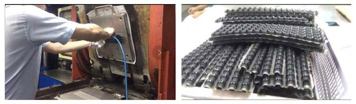 這款檢測(cè)筆硅膠按鍵要生產(chǎn)起來(lái)還是存在一些難點(diǎn)的,首先是它的模具采用了拋光處理,在油壓成型的時(shí)候,只能?chē)姾苌俚拿撃?,加之弧形結(jié)構(gòu)和新模的緣故所以一開(kāi)始脫模非常困難。經(jīng)過(guò)工程和油壓技術(shù)技術(shù)同事的多次調(diào)整,一方面是在不影響產(chǎn)品尺寸的情況下均勻的補(bǔ)一點(diǎn)料以增加毛邊厚度,另一方面通過(guò)洗模和遠(yuǎn)距離噴少量脫模水來(lái)降低硅膠對(duì)鋼模的吸附性,后借助氣槍和脫模時(shí)手上的巧勁終于實(shí)現(xiàn)了完整的脫下一整模。