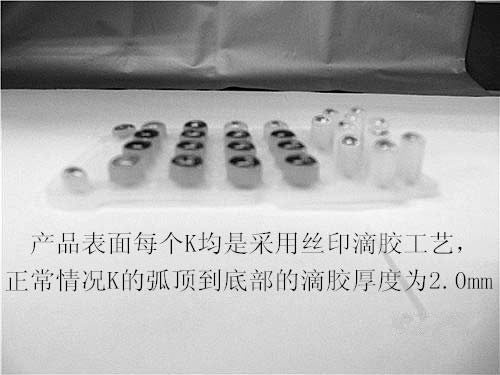 這款產品是一款用在醫(yī)療器材上面的按鈕,因此客戶要求表面的字符必須清晰而且長久耐用,所有客戶會選擇表面滴膠工藝,如圖: