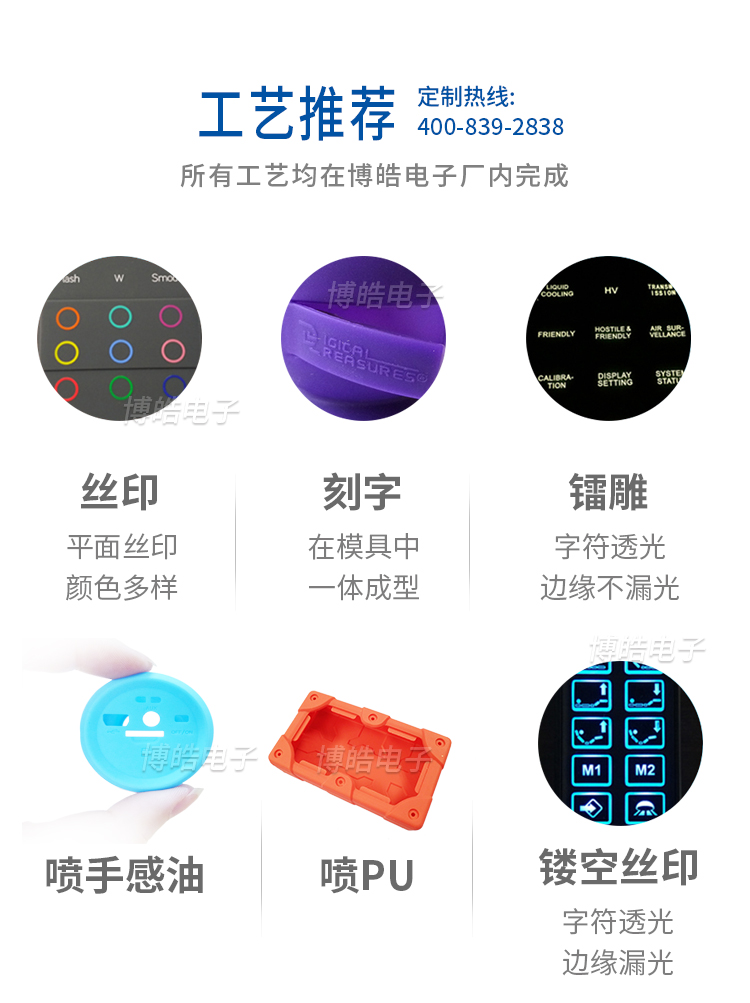 多色成型、碳粒成型、塑膠注塑、背面絲印、套色絲印、點印導(dǎo)電、移印導(dǎo)電、表面噴涂、激光鐳射 激光鐳雕、套色遮噴、噴PV保護油、噴UV保護油、滴膠、P+R組裝。 |