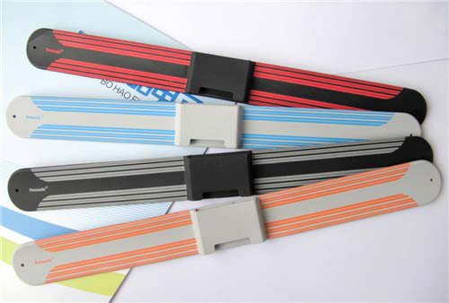 硅膠拍拍帶是最近市場比較流行的一款運(yùn)動型產(chǎn)品的附屬品,產(chǎn)品主要是運(yùn)用在電子手表,脈搏測試儀或者純屬裝飾品。這種產(chǎn)品因?yàn)轭伾容^多,經(jīng)過的各段的工藝流程比較復(fù)雜。而博皓電子在經(jīng)過不到4年的發(fā)展已經(jīng)擁有3個(gè)工廠的生產(chǎn)規(guī)模,目前擁有成型機(jī)器42臺,生產(chǎn)需要的相應(yīng)絲印設(shè)備噴涂設(shè)備一應(yīng)俱全,并且每個(gè)工廠能維持在150人的生產(chǎn)力,所有的工藝均是在本廠內(nèi)部完成。
