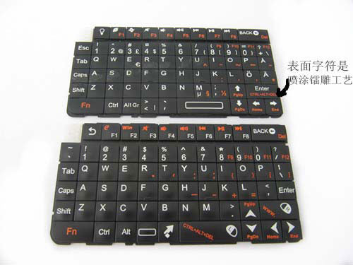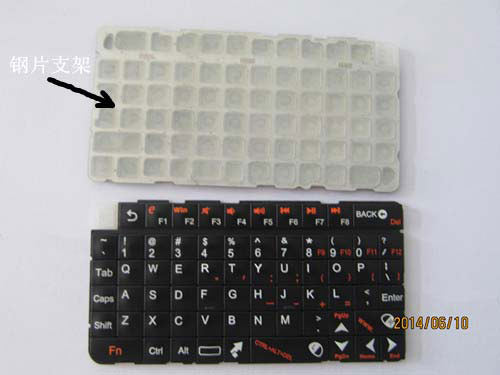 1.在塑膠和硅膠之間增加一層0.02mm后的鋼片,增加這種鋼片是取到整個鍵盤的按鍵帽的支撐作用。這個是我們工程師參照老的手機按鍵的設(shè)計結(jié)構(gòu)結(jié)合客戶需求研發(fā)出的一款大面積多鍵帽組裝的一款電子詞典鍵盤。